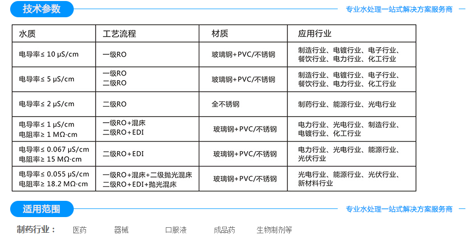 國家對制藥行業的用水要求十分嚴格,所以制藥行業用純化水設備的產水需要符合《中國藥典》(2015年版),我公司純化水系統遵循GMP要求設計制造,根據源水水質設計純化水工藝,同時為客戶提供完整的GMP系統驗證服務,系統采用自動控制方式,穩定可靠、精致美觀,是醫藥生產及制藥行業純化水設備首選。